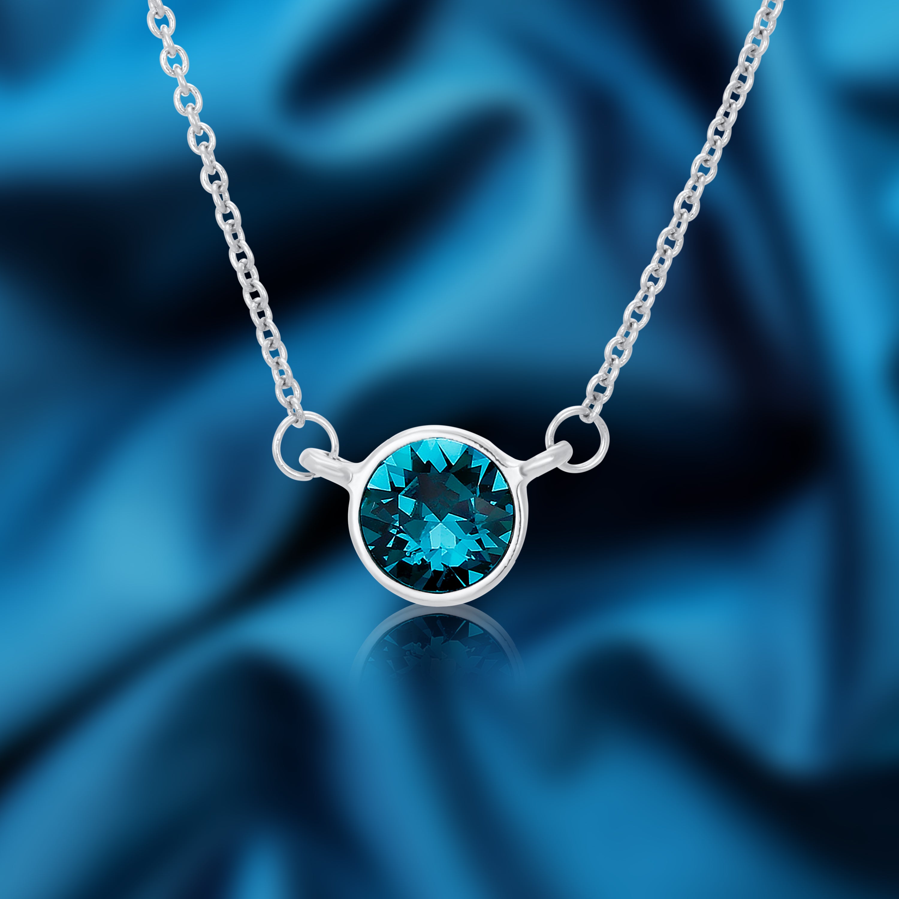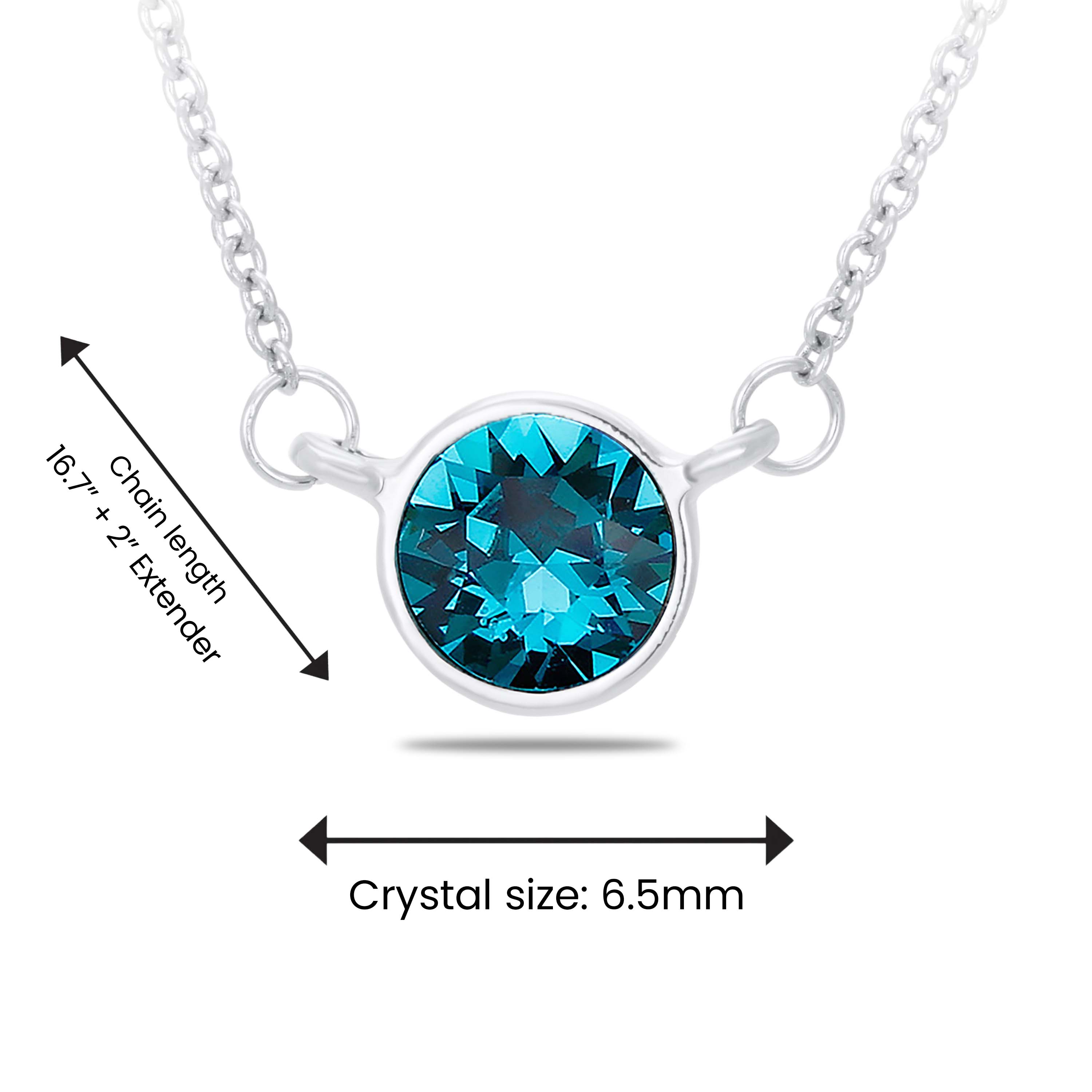 Round single stone crystal pendant. Bezel Setting. Necklace Chain linked to the pendant on the two sides. Austrian crystals. Simulated Blue Zircon