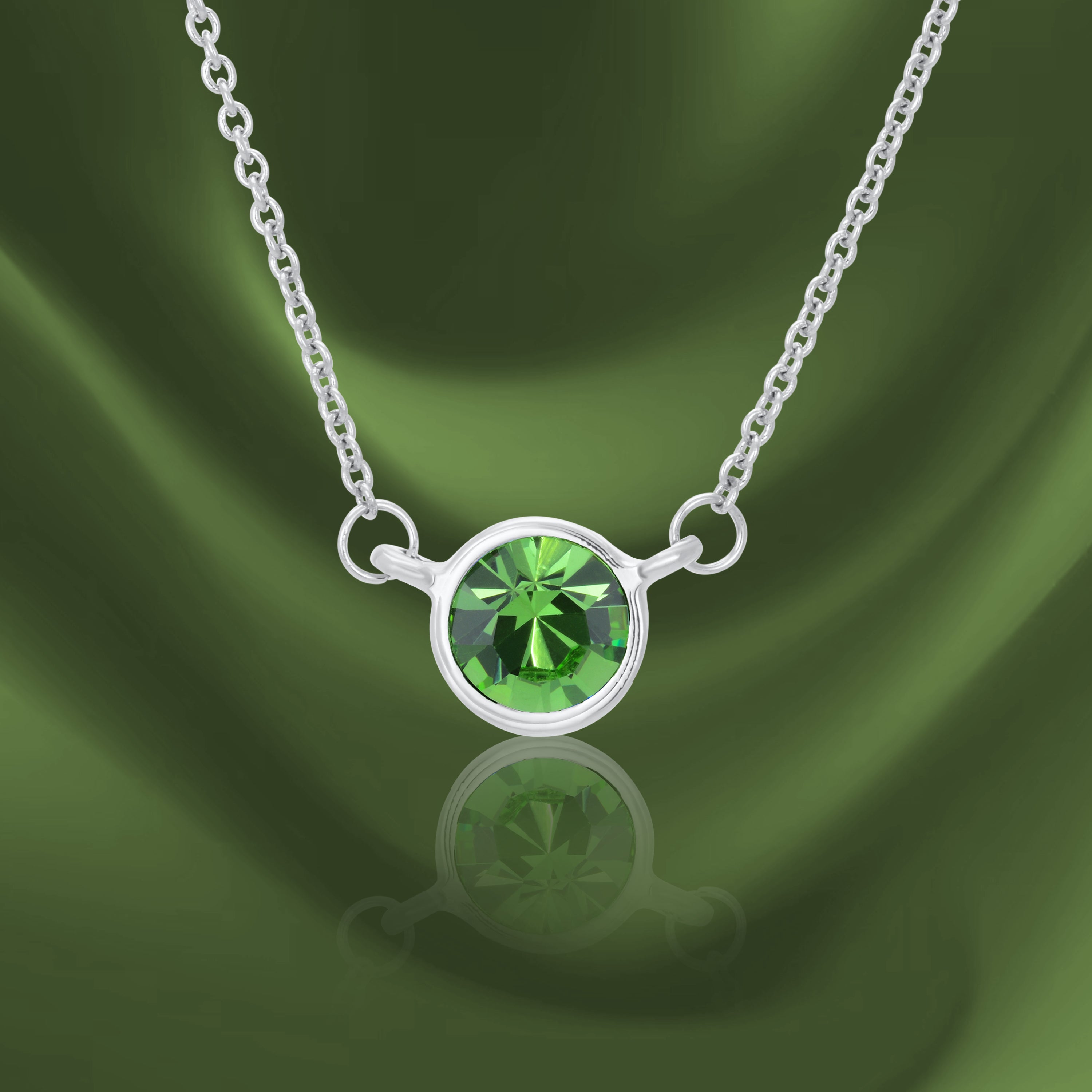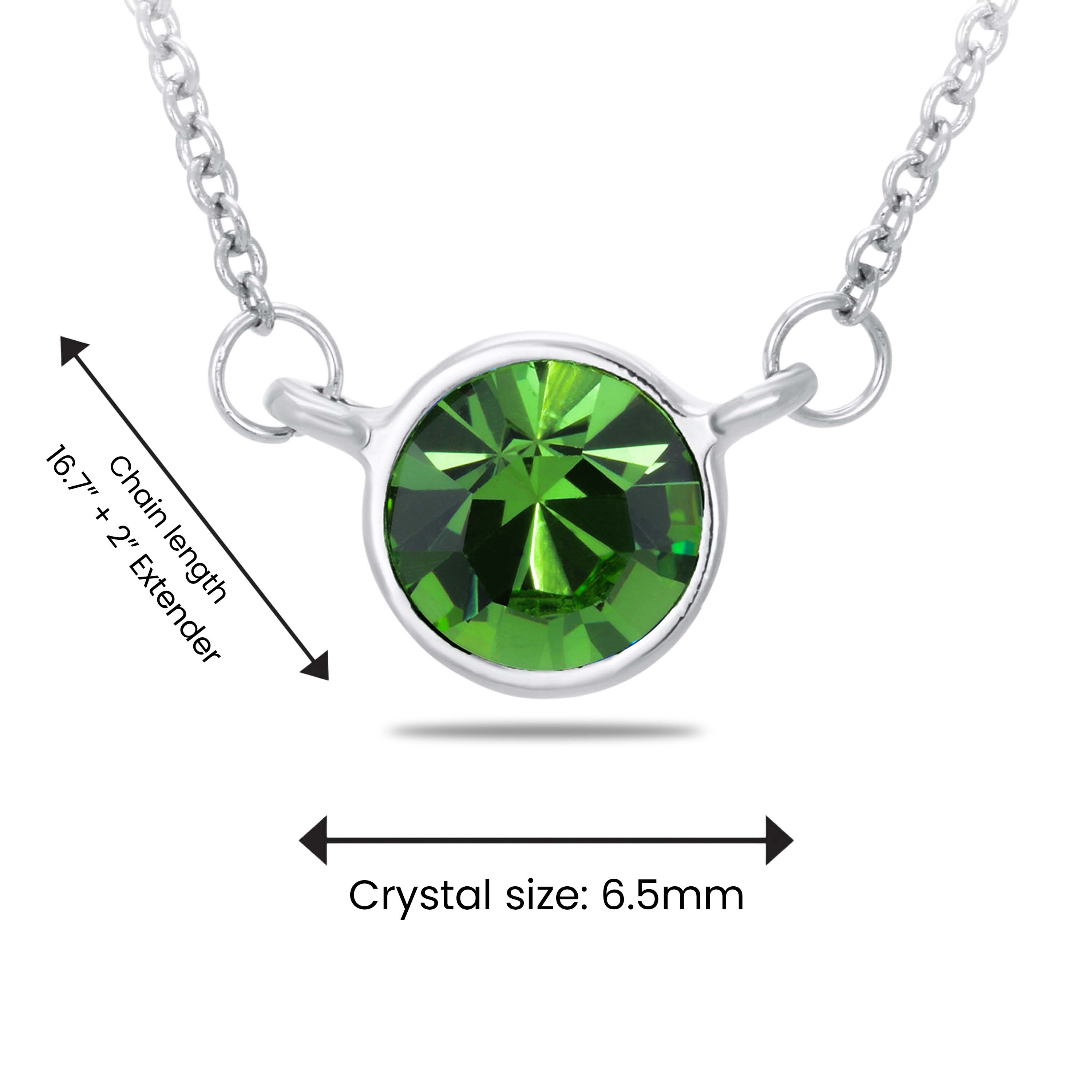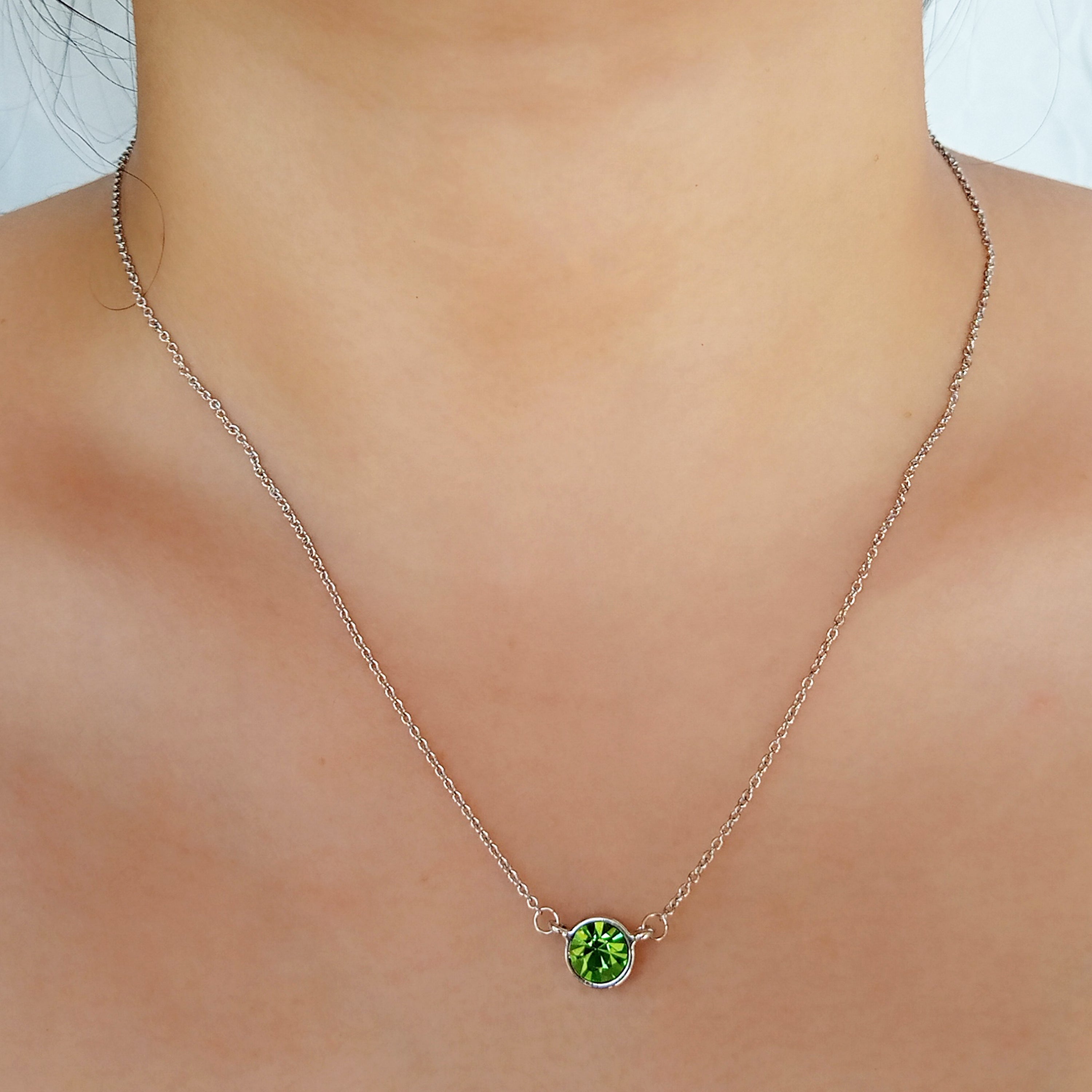 Round single stone crystal pendant. Bezel Setting. Necklace Chain linked to the pendant on the two sides. Austrian crystals. Simulated Peridot