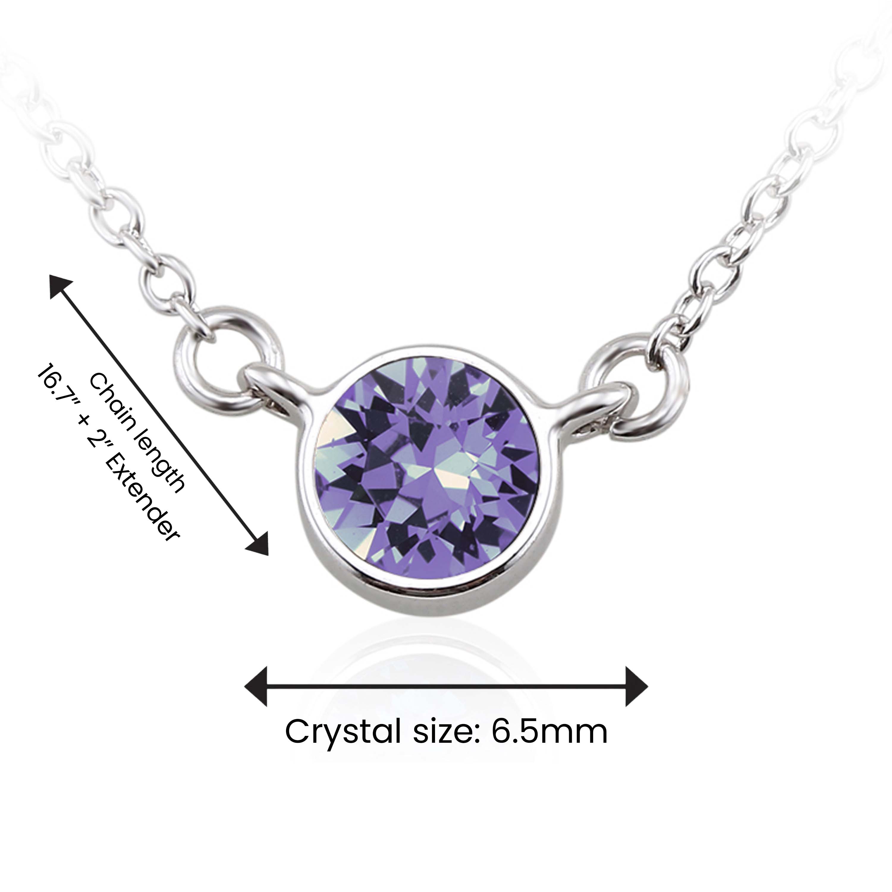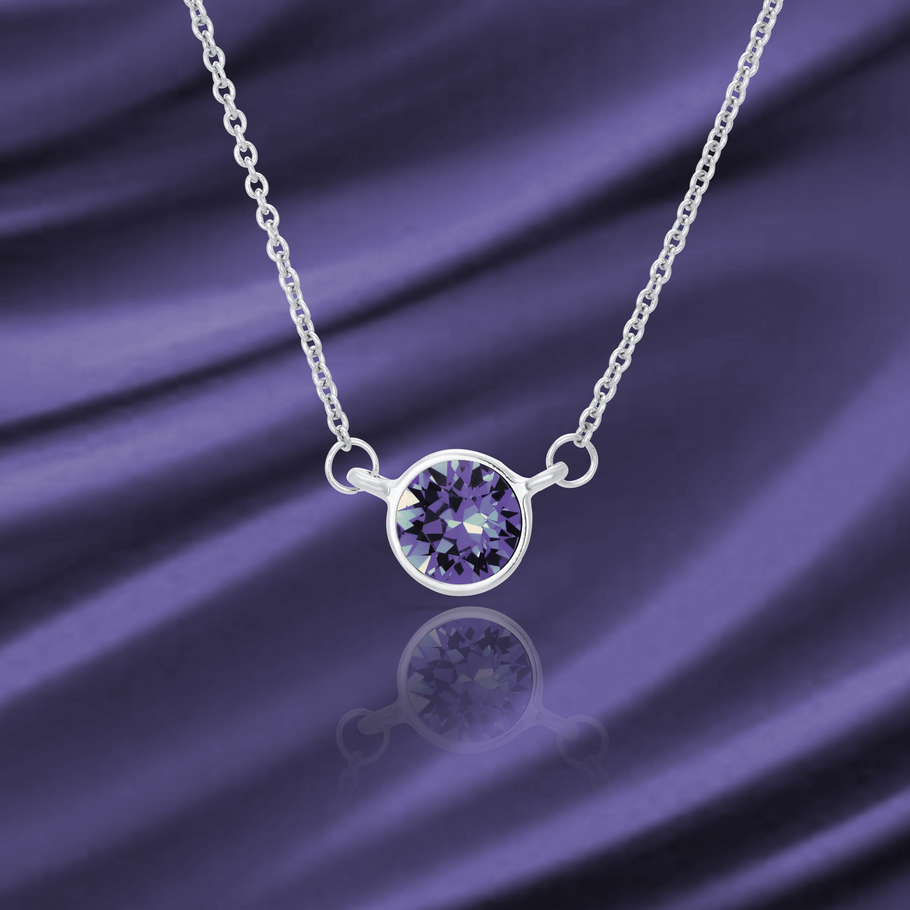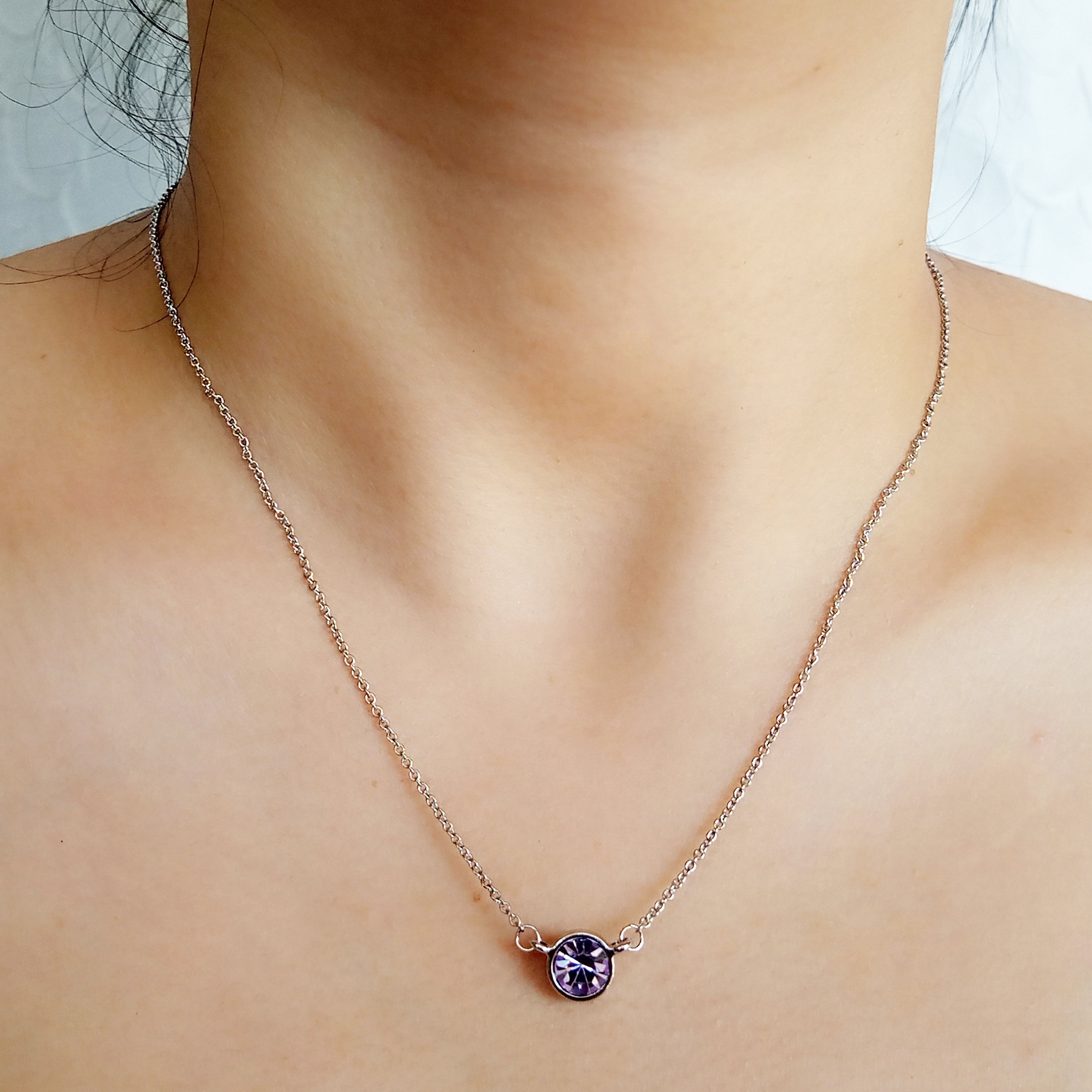 Round single stone crystal pendant. Bezel Setting. Necklace Chain linked to the pendant on the two sides. Austrian crystals. Violet
