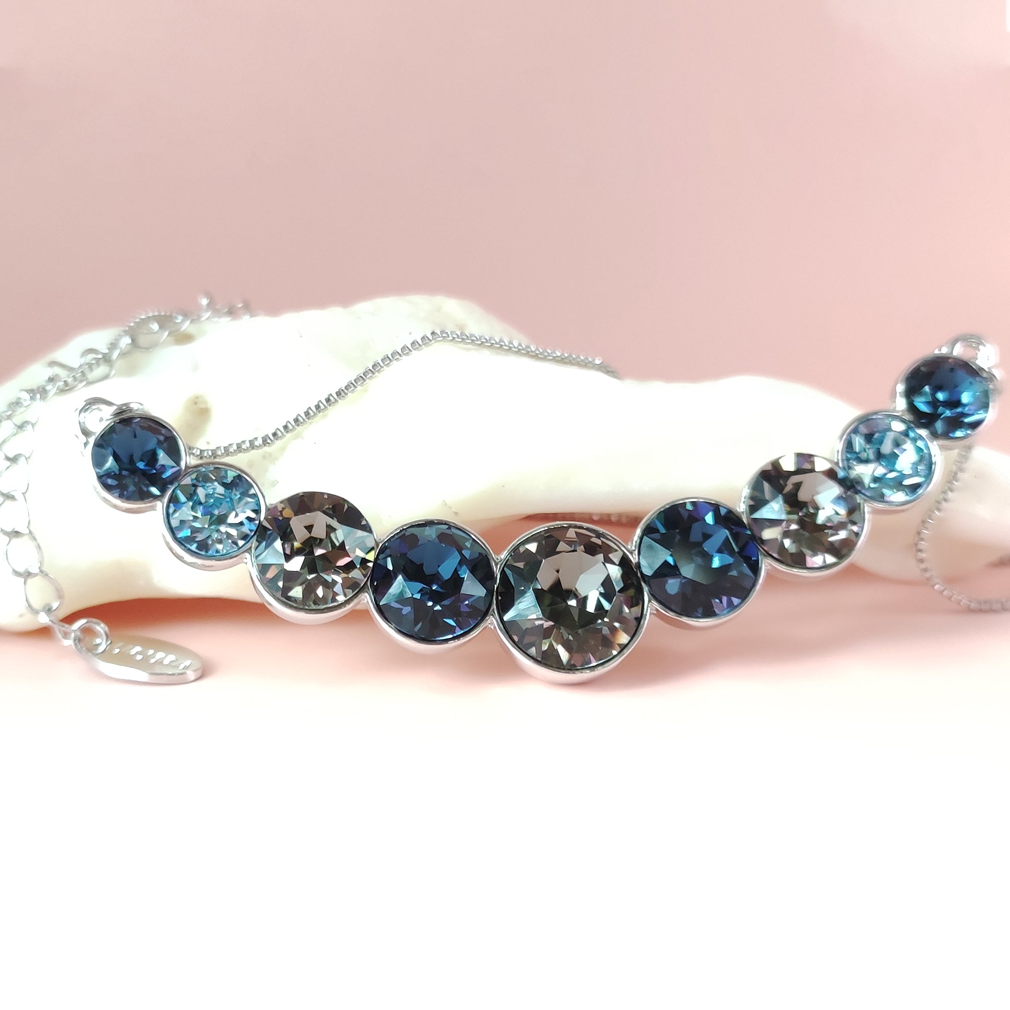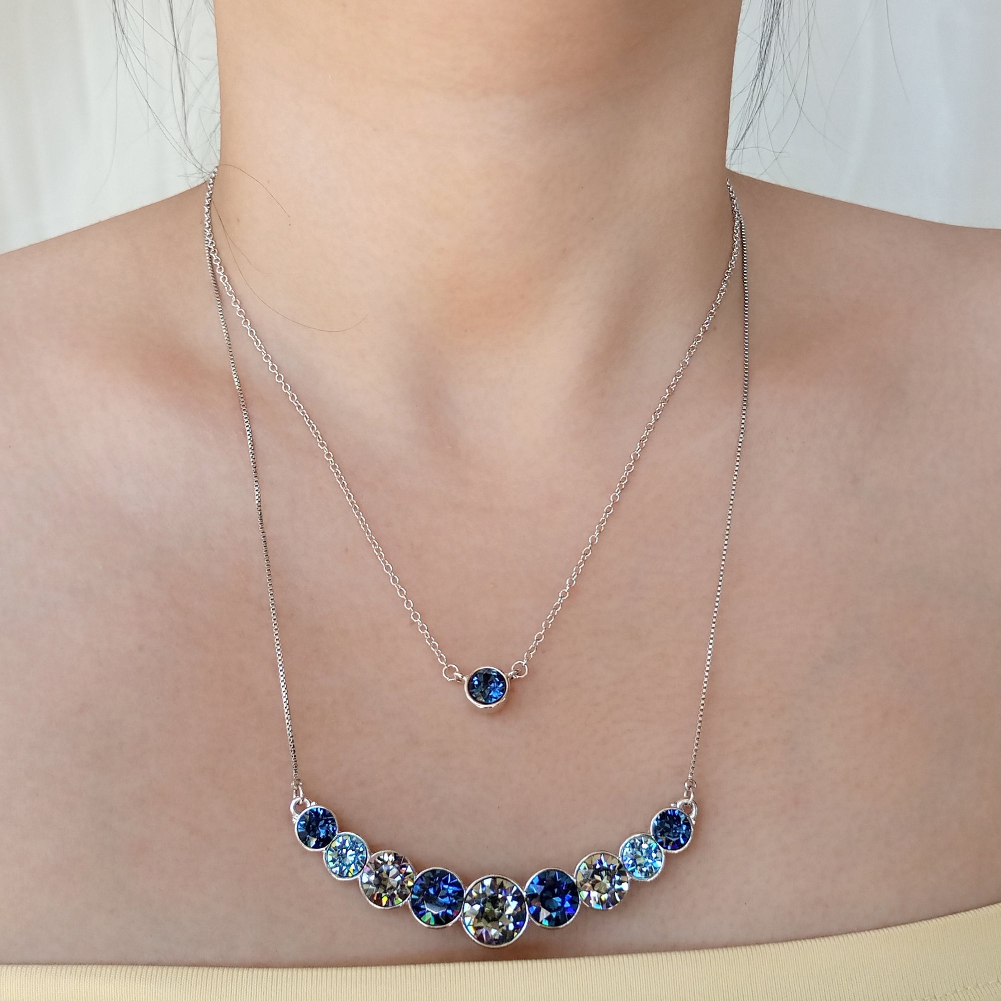 Our Graduated Multi Stone Necklace features a stunning pendant adorned with nine meticulously studded Austrian crystals on a gracefully curved bar. The combination of simulated Montana crystals in a deep navy blue hue, ethereal aquamarine crystals in a light blue shade, and sleek black crystals creates a captivating and harmonious color palette. The arrangement of these crystals on the pendant showcases a perfect balance of sophistication and vibrancy, making this necklace a versatile accessory that effortlessly elevates any ensemble. It exudes a timeless elegance that will undoubtedly make a statement, whether worn casually or for a special occasion.