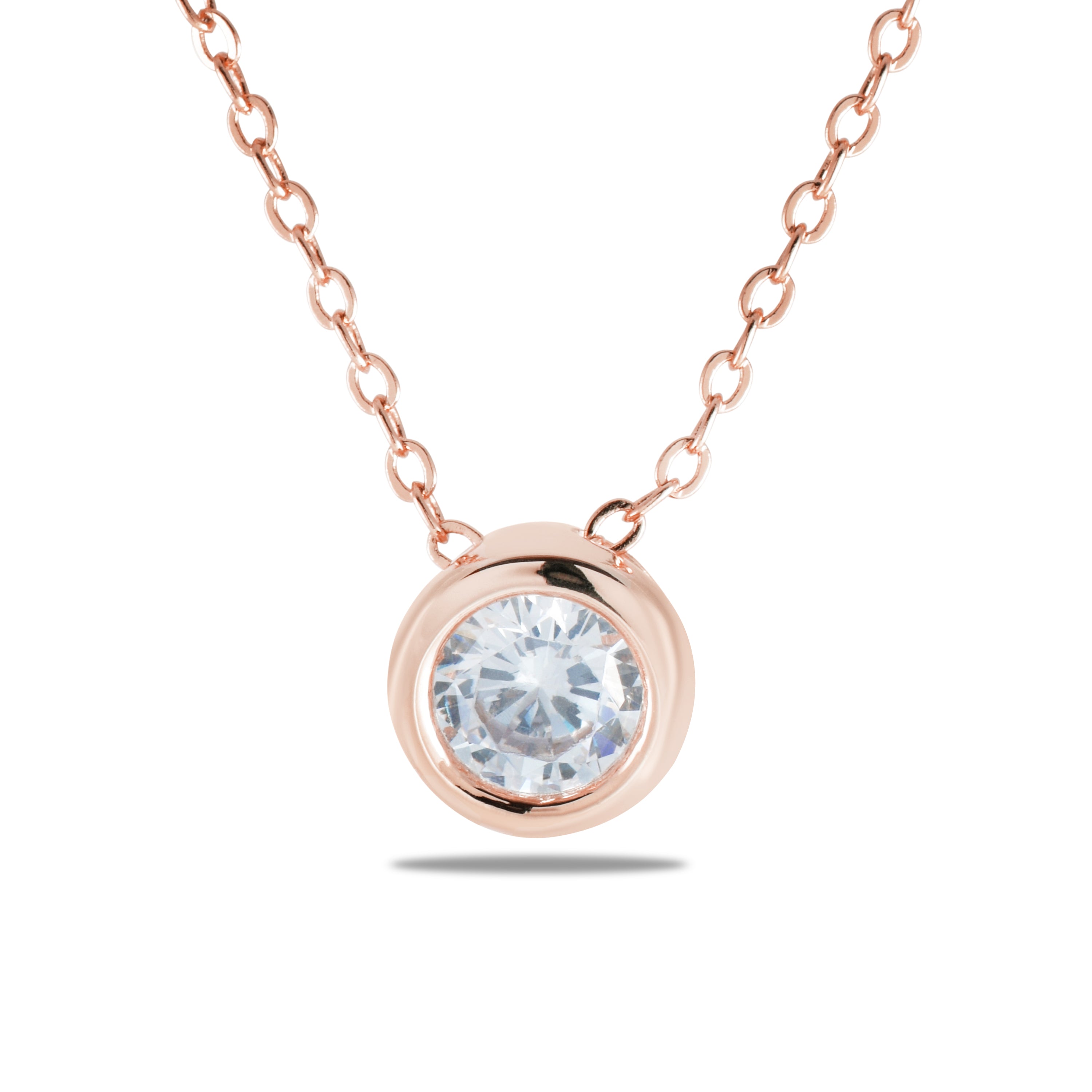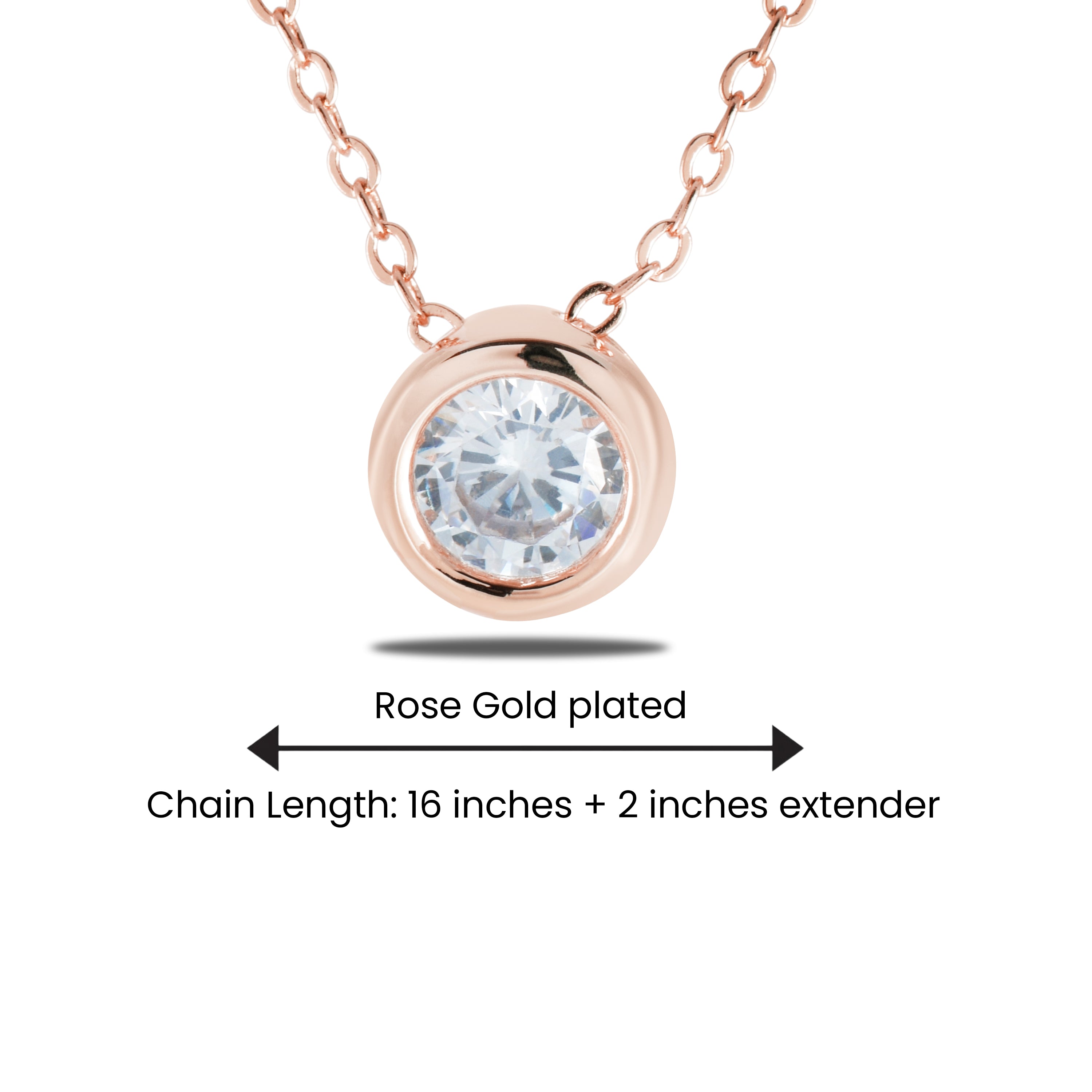Our Open Back Bezel Pendant will give your jewellery collection a hint of classic style. With an open-back design that light shine through, this gorgeous piece showcases a dazzling round cubic zirconia set in a slim bezel. This pendant, which is plated in opulent rose gold is ideal for any occasion because it blends classic design with contemporary charm. Its basic design easily goes with both formal and informal ensembles, and its adjustable rolo chain guarantees a comfortable neck piece.