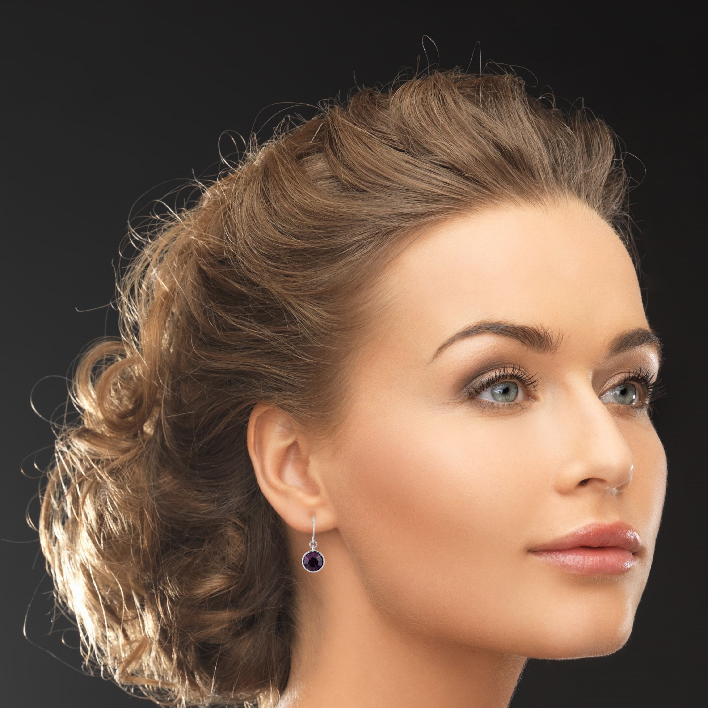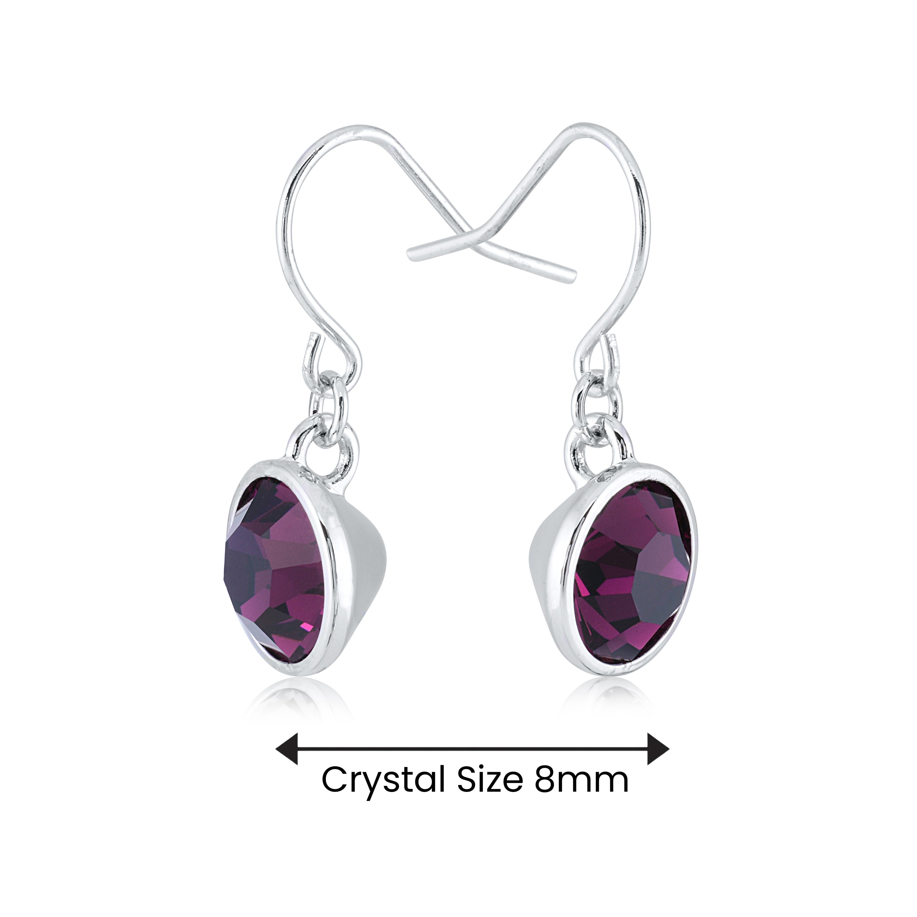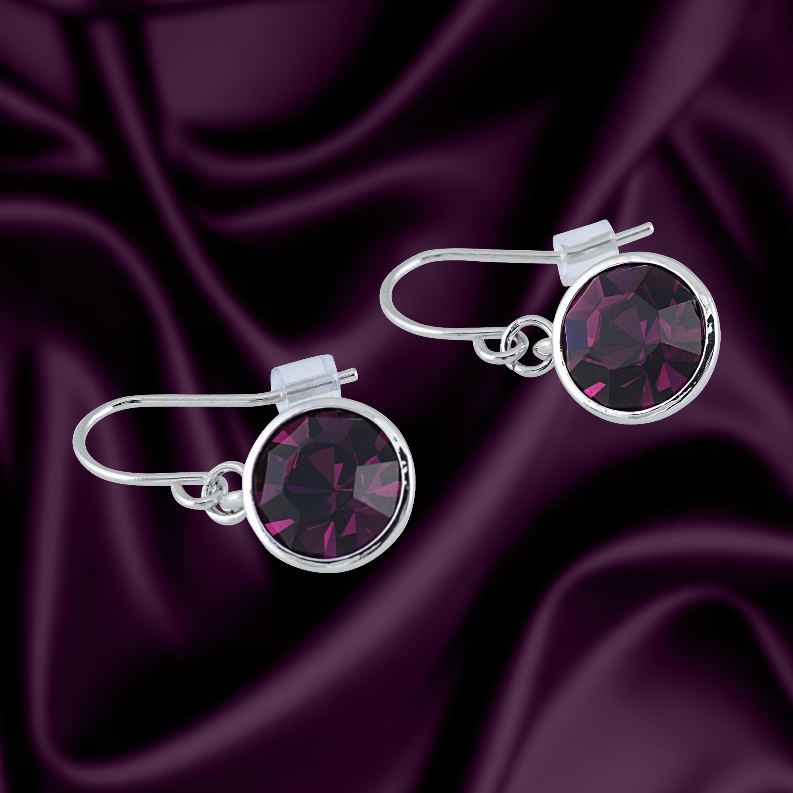 Round Crystal Dangle Drop Earrings. Crystal in Bezel setting and conical shaped back. Fishhook clasp. Comes with safety back stopper. Crystals are dangly - they move with you. Simulated Amethyst