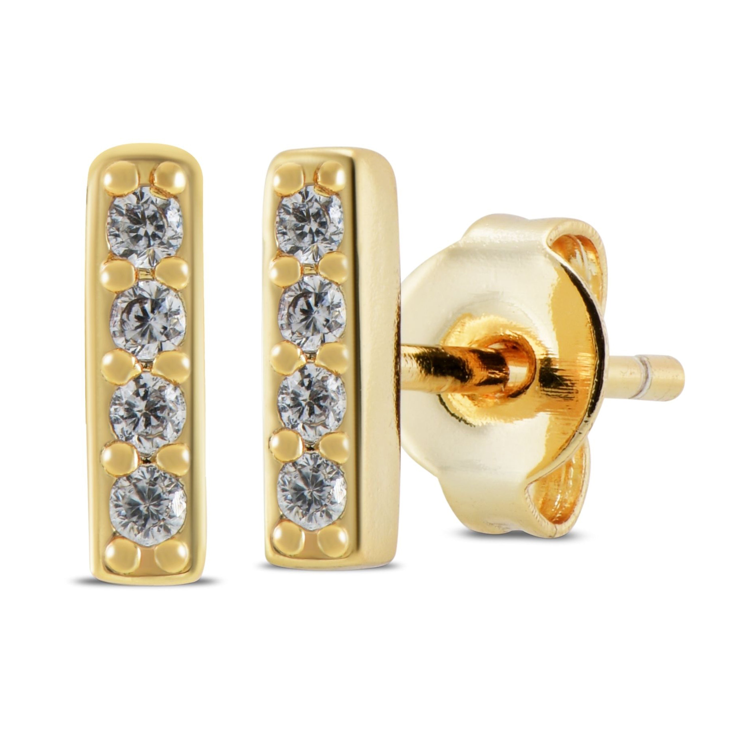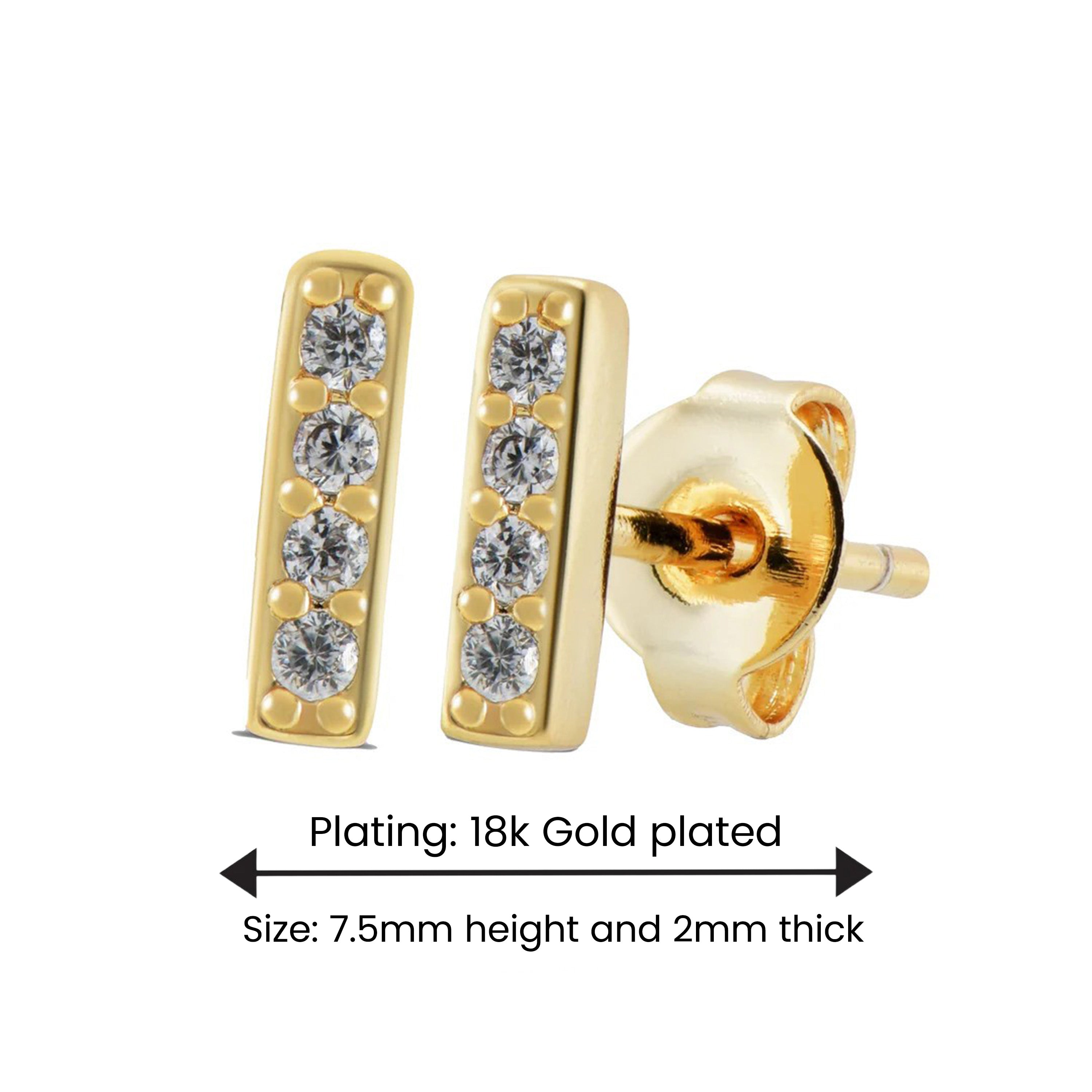 Delicate 18k Gold Plated Studs – 7.5mm height and 2mm thick, Accented with Dazzling Cubic Zirconia for an Elegant Sparkle.